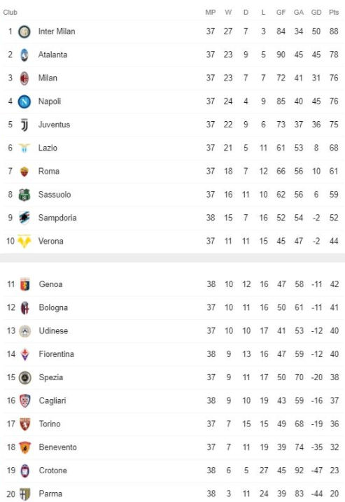 Klasemen Liga Italia 2020/2021 menuju pekan terakhir: