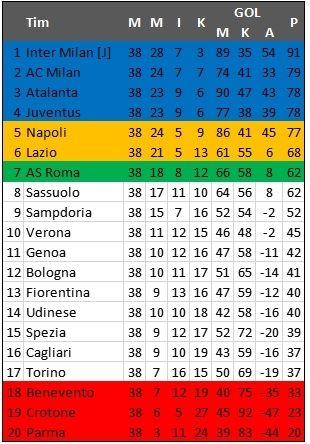 Klasemen Liga Italia Pekan ke-38 atau pekan terakhir musim 2020/2021. (Antara)