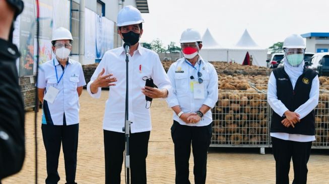 Presiden Jokowi saat mengunjungi pabrik pengolahan porang milik PT Asia Prima Konjac dalam kunjungan kerjanya ke Kabupaten Madiun, Provinsi Jawa Timur, Kamis (19/8/2021).