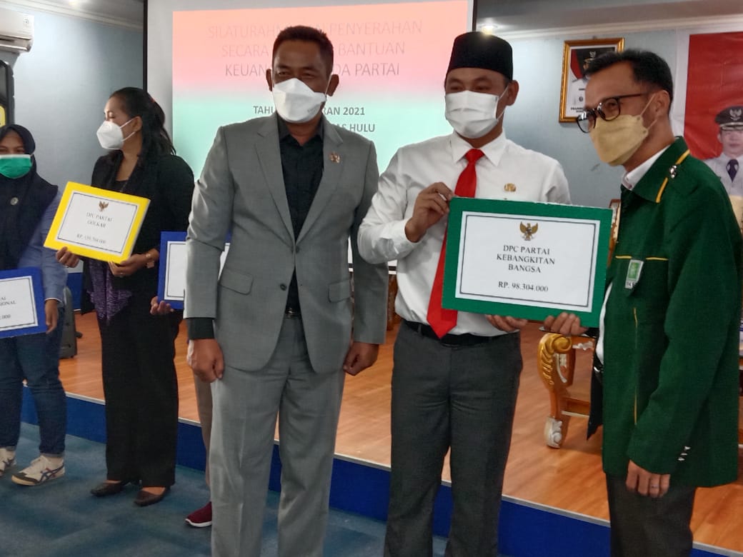 Bantuan diserahkan Wakil Bupati Kapuas Hulu Wahyudi Hidayat di aula Bappeda setempat, Selasa (21/09/2021). Adapun kesepuluh Parpol mendapatkan bantuan Partai Golongan Karya (Golkar), Partai Persatuan Pembangunan (PPP), Partai Amanat Nasional (PAN), Partai Demokrasi Indonesia Perjuangan (PDIP), Partai Demokrat, Partai Kebangkitan Bangsa (PKB), Partai Hati Nurani Rakyat (Hanura), Partai Gerakan Indonesia Raya (Gerindra), Partai Keadilan dan Persatuan Indonesia (PKPI) dan Partai Nasional Demokrat (NasDem).