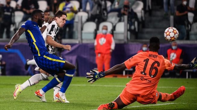 Aksi penyerang sayap Juventus Federico Chiesa membobol gawang Chelsea di laga lanjutan Liga Champions, Kamis (30/9/2021) dini hari WIB.