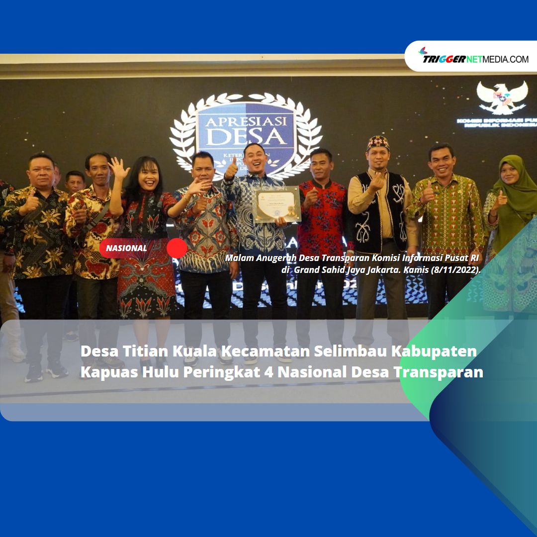triggernetmedia.com – Komisi Informasi Pusat Republik Indonesia memberikan apresiasi terhadap Desa Titian Kuala Kecamatan Selimbau Kabupaten Kapuas Hulu yang meraih peringkat ke-4 Nasional Desa Transparan. Penghargaan ini diterima langsung oleh wakil Bupati Kapuas Hulu, Wahyudi Hidayat, di Grand Sahid Jaya Jakarta. Kamis (8/11/2022).