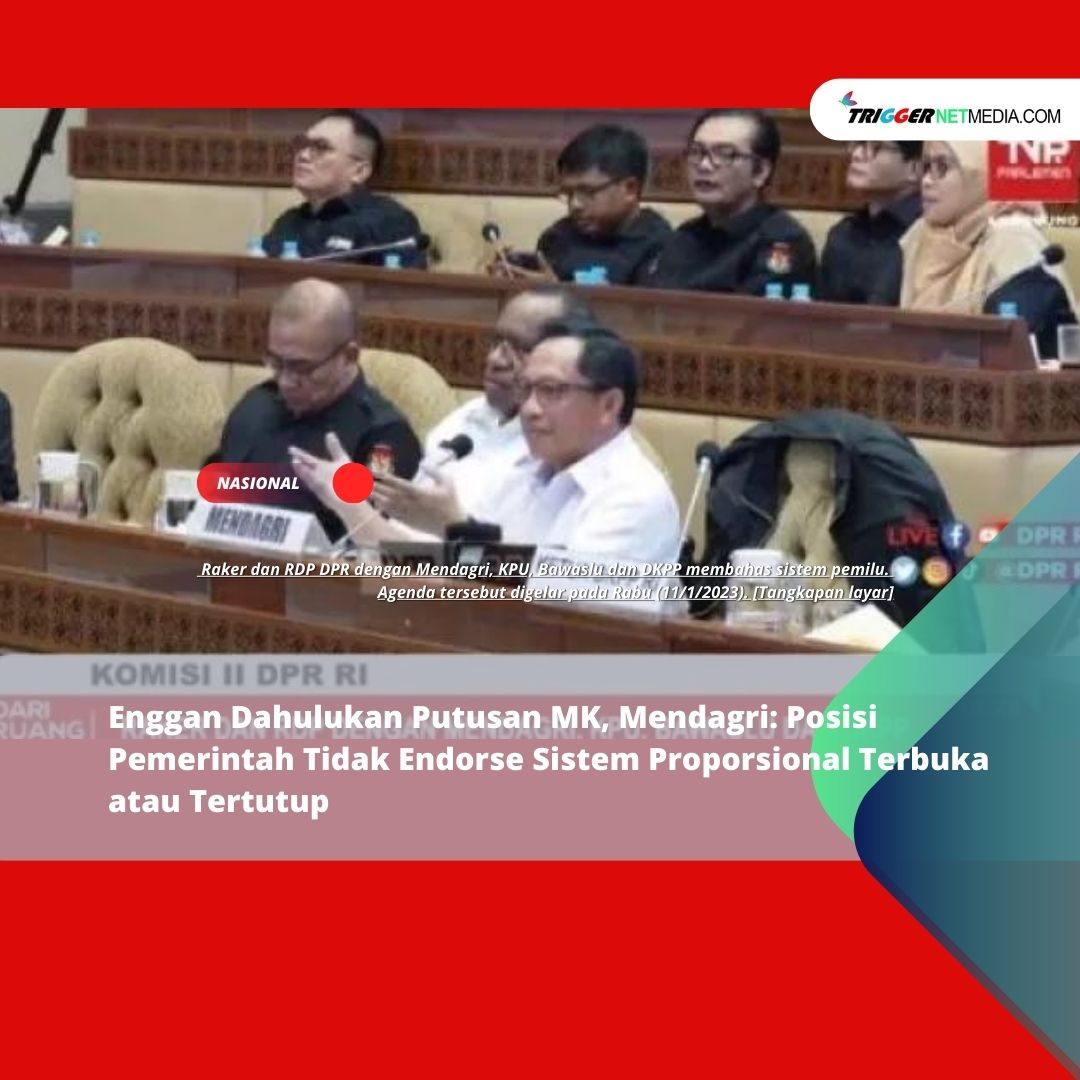 triggernetmedia.com – Menteri Dalam Negeri (Mendagri) Tito Karnavian menyatakan keberatan, jika pihaknya ikut dibawa dalam kesimpulan rapat di Komisi II DPR pada hari ini, Rabu (11/1/2023). Adapun kesimpulan rapat itu mengenai sistem proporsional terbuka.