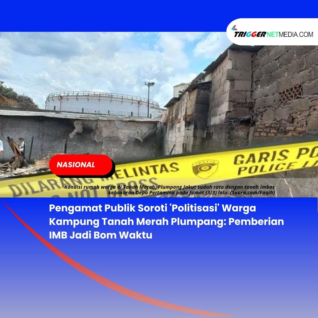 triggernetmedia.com – Pengamat kebijakan publik Trubus Rahadiansyah menyoroti “politisasi” pemberian Izin Mendirikan Bangunan (IMB) kawasan yang diterbitkan pada 2021 kepada masyarakat Tanah Merah, Plumpang, Jakarta Utara yang lokasinya bersebelahan dengan Depo Pertamina Plumpang yang terbakar pada Jumat (3/3/2023) lalu.