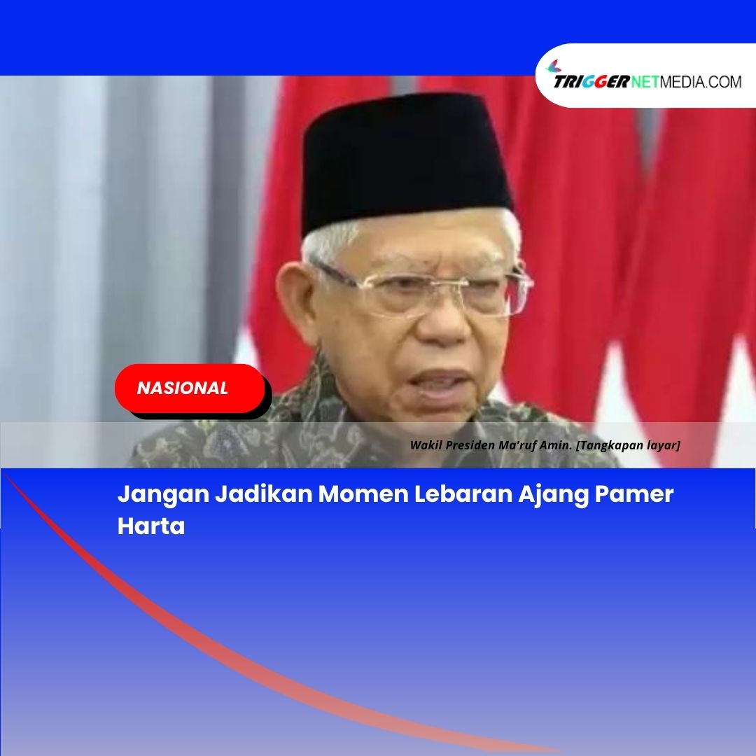 triggernetmedia.com – Wakil Presiden (Wapres) Ma’ruf Amin mengajak seluruh elemen masyarakat agar mengimplementasikan sikap sederhana pada perayaan Idul Fitri maupun pada hari-hari lainnya secara umum. Dia mengingatkan, momen lebaran kali tidak dimanfaatkan untuk pamer harta.