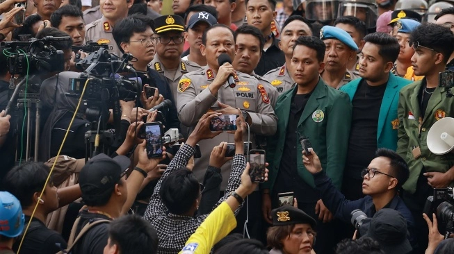 Kapolda Metro Jaya Irjen Pol Asep Edi Suheri (tengah) sampaikan pernyataan saat temui massa di Polda Metro Jaya, Jakarta, Jumat (29/8/2025). [ANTARA FOTO]